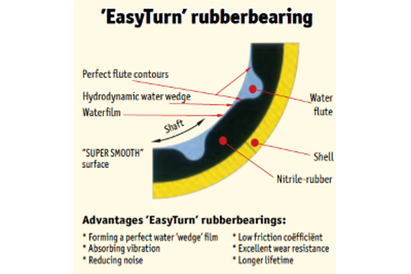 EasyTurn rubber bearings have an optimized flute design for maximum hydrodynamic-wedge performance; creating the best possible water film between the rubber and shaft surface. Even after many years of service rubber bearings are still working quietly without vibrations. No other type of bearing is capable of this.